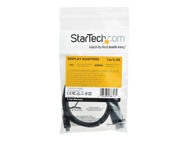 StarTech.com 1 m USB-C till DisplayPort 1.4-kabel - dubbelriktad - DisplayPort-kabel - USB-C (hane) till DisplayPort (hona) - USB 3.1 / Thunderbolt 3 / DisplayPort 1.4 - 1 m - aktiv, 8K UHD-stöd (7680 x 4320) - svart CDP2DP141MBD
