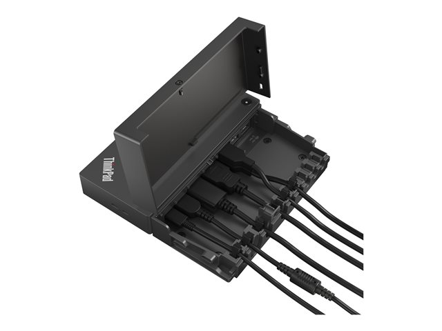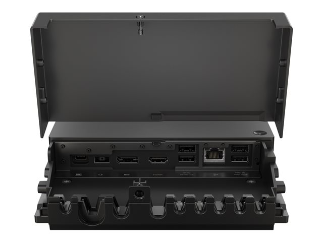 Lenovo ThinkPad Universal USB-C Smart Dock - ThinkSmart Edition är utformad för mångsidiga anslutningsmöjligheter och effektiv produktivitet. Med en rad portar, inklusive USB 3.2 Gen 2, HDMI och DisplayPort, rymmer denna dockningsstation olika enheter och kringutrustning, så att användarna kan utöka sin arbetsyta. Dockningsstationen har stöd för dubbla skärmar, vilket är perfekt för multitasking-proffs som behöver förbättrade visuella upplevelser på flera skärmar. Dockningsstationen är utrustad med en 2 m lång extern USB-C till USB-C-kabel som ger tillförlitliga anslutningar. Den tillhandahåller viktiga gränssnitt som Ethernet och ljud och ger upp till 135 watt ström via strömadaptern för att ladda kompatibla enheter. Dessutom säkerställer funktioner som Kensington-säkerhetslås och två separata lås att både dockan och anslutna enheter förblir säkra, vilket ökar sinnesfriden för användarna.